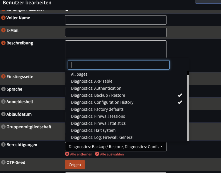 1. Benutzer erstellen, Berechtigungen müssen so aussehen: